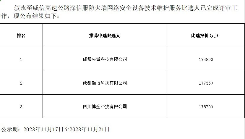 敘永至威信高速公路深信服防火墻網(wǎng)絡(luò)安全設(shè)備技術(shù)維護(hù)服務(wù)比選結(jié)果公示