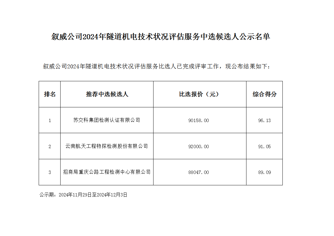 敘威公司2024年隧道機(jī)電技術(shù)狀況評估服務(wù)中選候選人公示名單