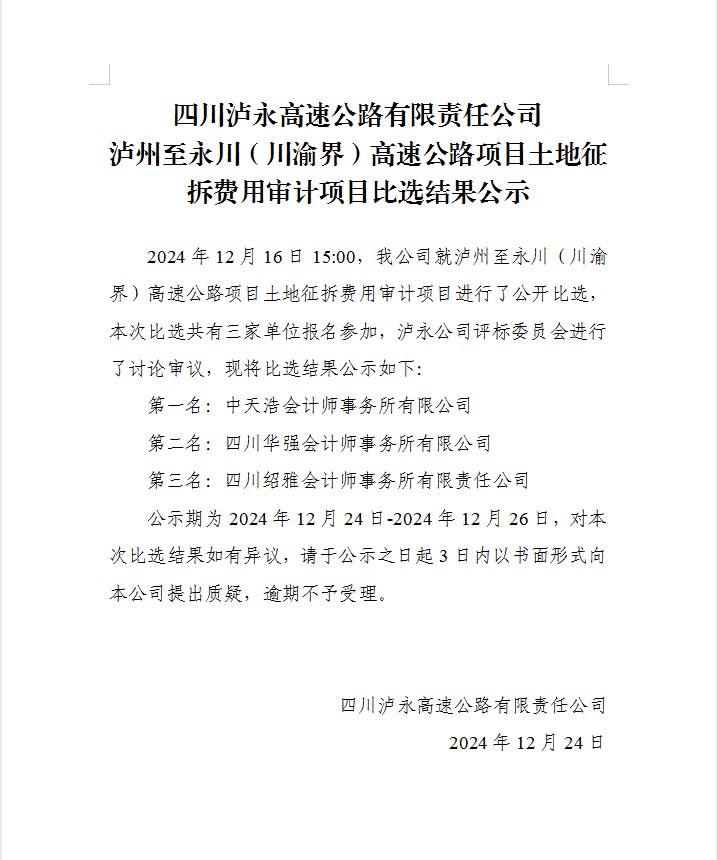 四川瀘永高速公路有限責任公司瀘州至永川(川渝界)高速公路項目土地征拆費用審計項目比選結果公示