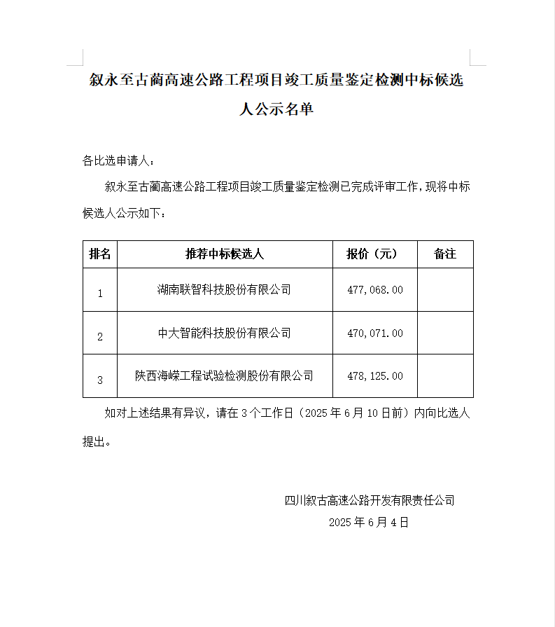 敘永至古藺高速公路工程項目竣工質量鑒定檢測中標候選人公示名單