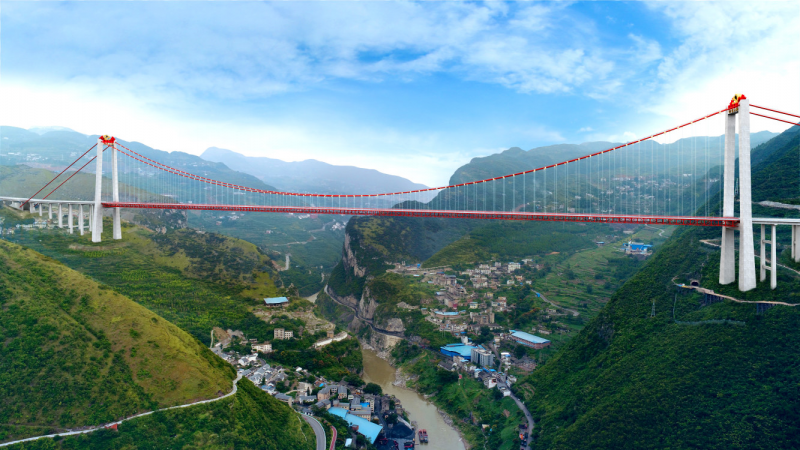 82年前,赤水之濱上演了一場“長征史上最光彩神奇的篇章”,82年后,一條承載著川黔兩地老區(qū)人民高速夢的神奇天路在此處正拔地而起。赤水河大橋主跨1200米,是世界上同類型橋梁中跨徑第二、主塔高度第二的峽谷鋼桁梁懸索大橋,該橋為325m+1200m+205m雙塔單跨吊鋼桁梁懸索橋,貴州岸錨碇為重力錨,四川岸錨碇為隧道錨。貴州岸引橋為2×30m+4×(4×40m)先簡支后結(jié)構(gòu)連續(xù)T梁,四川岸引橋為3×33m現(xiàn)澆預(yù)應(yīng)力混凝土箱梁。該橋梁樁基均采用人工成孔,主墩采用18根Ф3.5m大直徑樁基。該橋的主要工程特點為:大:大橋主跨1200米,是世界上同類型橋梁中跨徑第二、主塔高度第二的峽谷懸索大橋。難:一是超高索塔施工難(索塔最大高度243.5m);二是主梁吊裝難(采用1200m大跨徑的纜索吊裝工藝);三是地勢險要,施工運輸難。險:橋位地處50-75°近乎垂直的陡坡上,施工十分驚險。