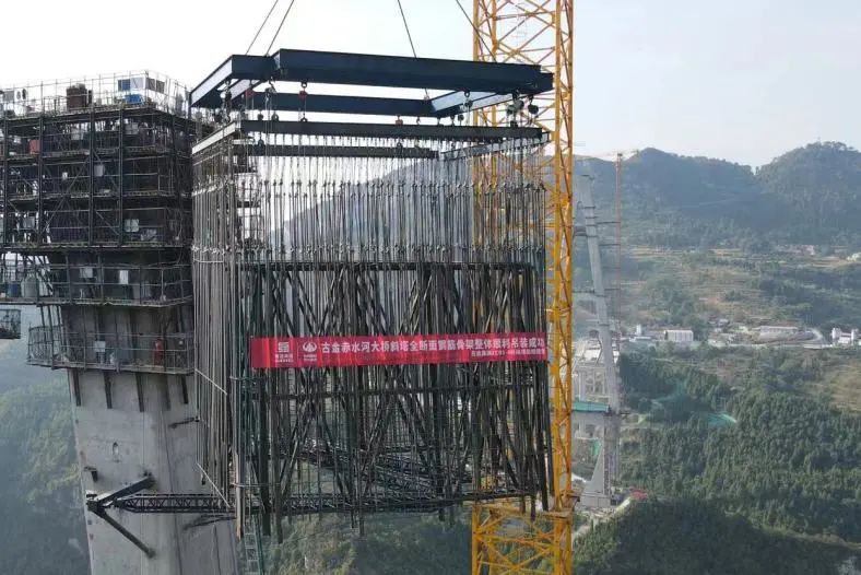古金高速赤水河特大橋斜塔全斷面鋼筋骨架整體順利吊裝